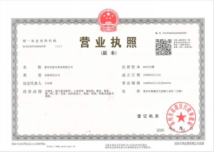 公司專業(yè)從事紡織業(yè)生產(chǎn)已三十多年,已成為一家從紡絲、織造、后整理到后加工一條龍的企業(yè)。公司位于江蘇省泰州市高港區(qū)大泗工業(yè)園區(qū),交通方便,占地100余畝,擁有現(xiàn)代化標(biāo)準(zhǔn)廠房,現(xiàn)有員工120人,年產(chǎn)過濾布300萬米、除塵布袋600萬米、縫包線、長絲線4...